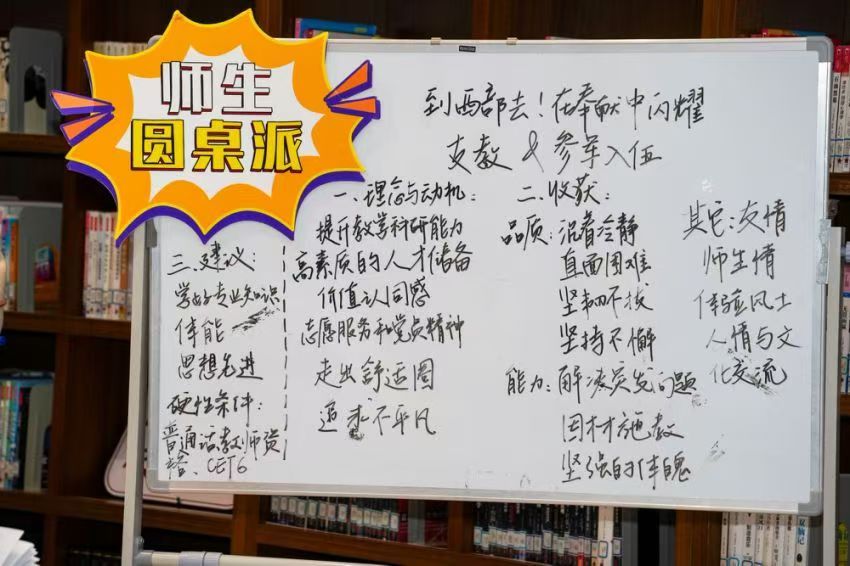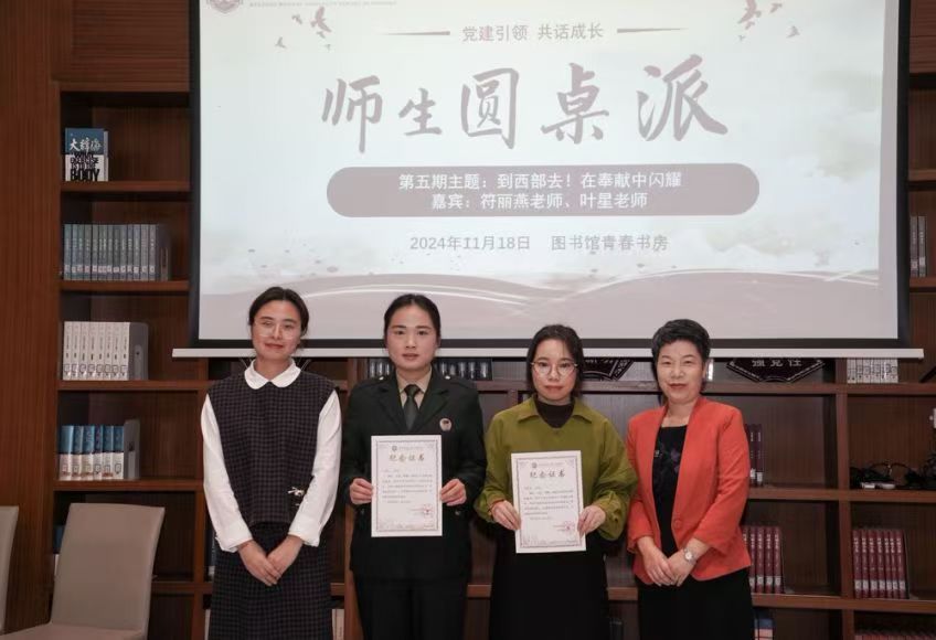 第五期师生圆桌派于11月18日下午在图书馆青春书房成功举办,本次活动以“到西部去!在奉献中闪耀”为主题,通过师生分享支援西部经历,共同探讨宝贵经验,更好奉献社会。本次活动嘉宾为黄色直播 符丽燕老师、叶星老师,肖芳同学、陈嘉泓同学,现场观众由学生党员、入党积极分子代表及线上2024级大一新生组成。