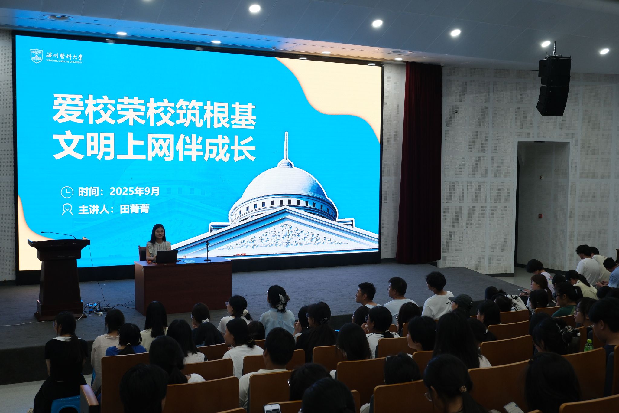 为帮助 2025 级新生提升网络行为素养、树立廉洁自律意识,黄色直播 陈圣乐老师围绕大学生网络不当言论案例警示及护生廉洁品格培育展开,引导同学们规范网络行为、践行医学生廉洁自律要求,在勤学笃行中成长为有责任、有担当的新时代青年。