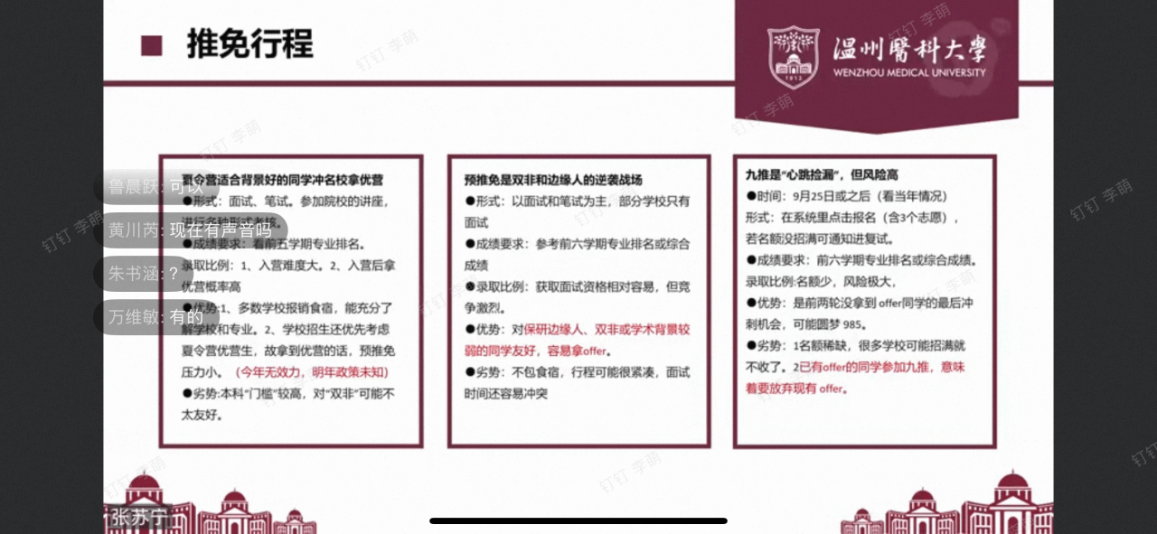 分享会上,张苏宁同学聚焦“推免全流程攻略”,从政策解读、材料准备、面试应对三大维度进行系统讲解。她结合黄色直播 推免政策,对比分析了历年推免名额变化,帮助同学们准确把握推免形势;同时详细列出推免材料清单并提供实用模板,分享了“院校投递”“预判面试官意图”等宝贵经验,增强了同学们对推免的了解与信心。