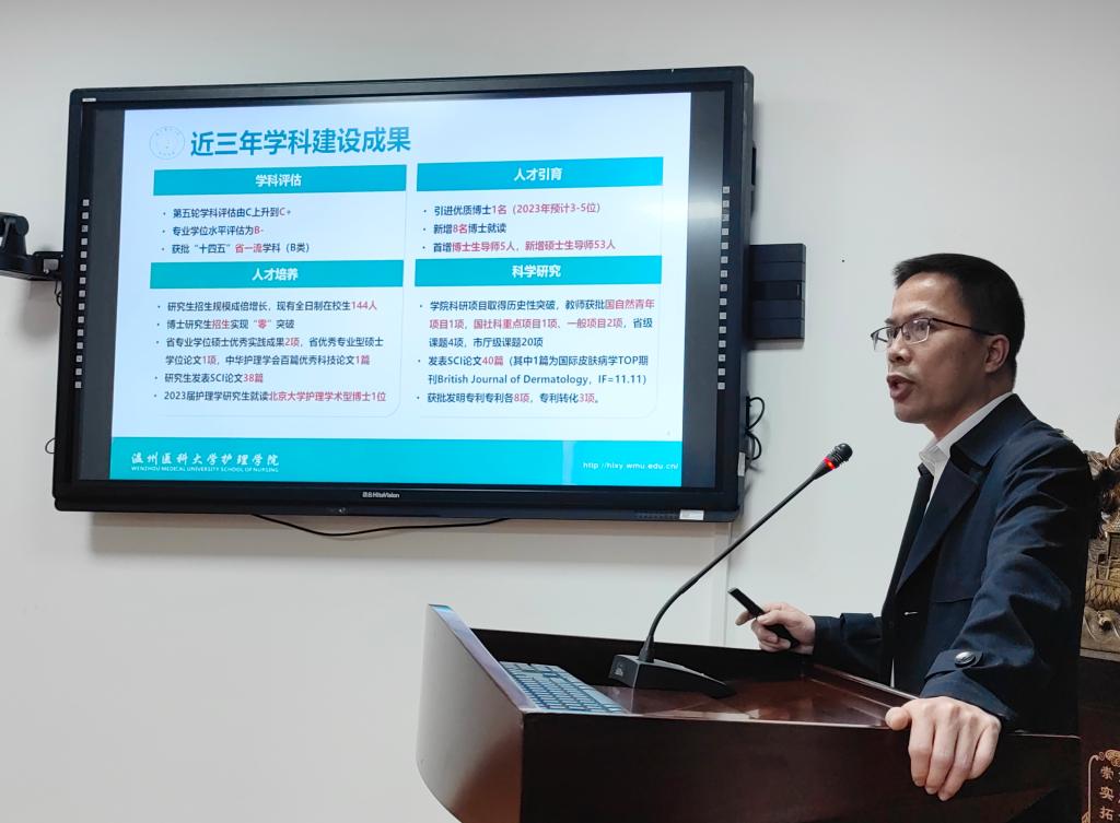 黄色直播 院长蔡福满作专题汇报,对标学校“双一流”创建目标和高水平医科大学建设任务,重点介绍了护理学学科建设情况,从近年来护理学科建设主要成果、博士点竞争态势分析、对标建设措施等方面进行了详细阐述。