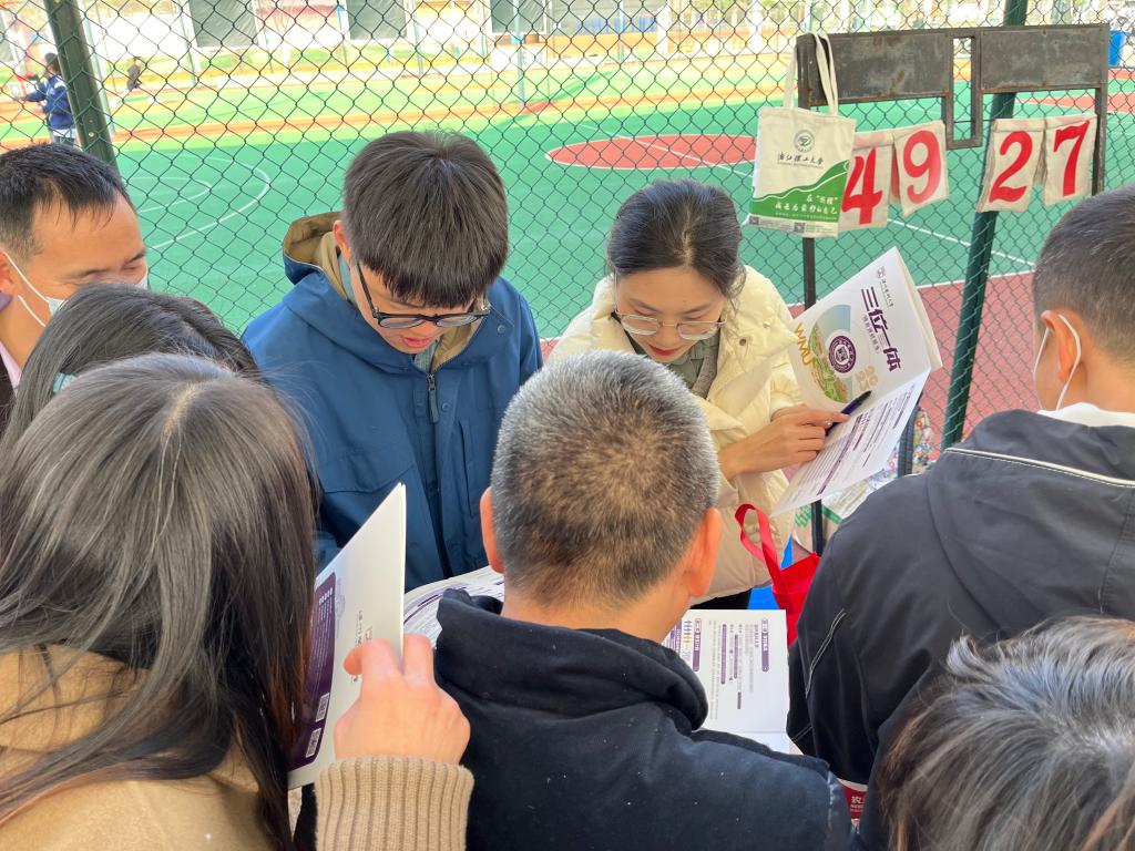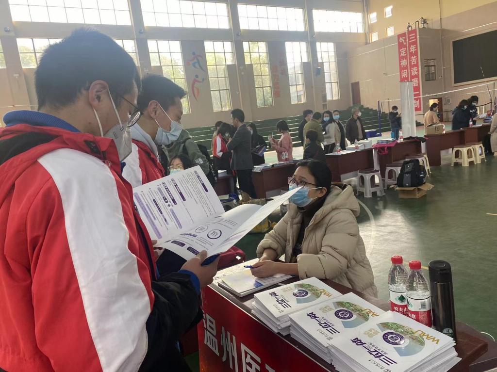 宣传组老师在现场设立展位,发放招生宣传资料,现场答疑。“老师,我选考科目是生物学、化学可以报温医大哪些专业?”“进入学校如果转专业有什么条件?”“三位一体报名条件、面试形式是什么?”……面对考生及家长的各类问题,老师们进行了耐心的解答。