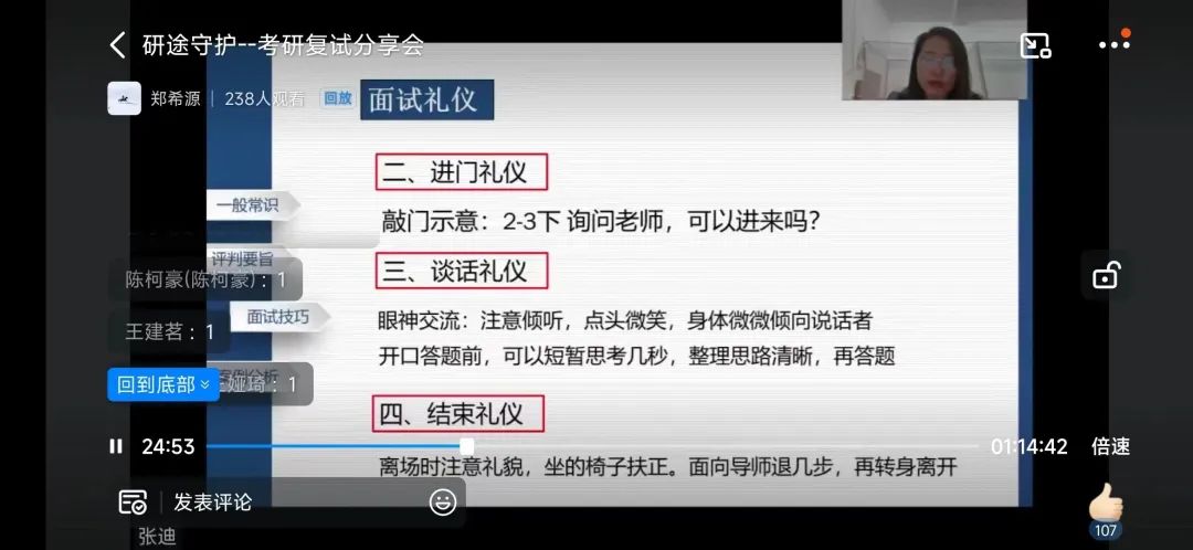 张迪老师以大学生考试学为理论基础,着重介绍了面试礼仪和答题技巧。张迪老师提醒同学们,在答题过程中思考全面,发挥自我优势,最好能够展现出专业基础知识、逻辑思维能力、语言表达能力、分析解决问题能力、创新潜质、举止仪表与专业能力以及思想道德品质等综合素养。此外,她还强调在面试过程中注意言行,如仪容礼仪,进门礼仪、谈话礼仪和结束礼仪等。