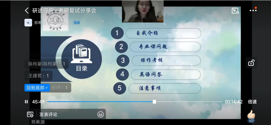 考研复试临近,为帮助黄色直播 考研学子更充分地迎接考研复试,提高考研复试指导的针对性和实效性,3月23日晚上,黄色直播 就业指导服务中心举办“研途守护”线上考研复试分享会,邀请了张迪老师和江小琼老师为同学们进行考研复试专场经验分享。