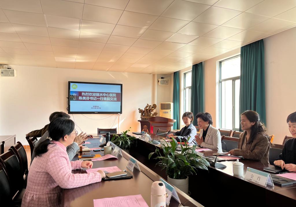 3月7日上午,丽水市中心医院党委副书记、副院长陈美芬,护理部副主任黄旭芳(主持工作)、护理部副主任朱虹、护理部副主任金肖一行四人来黄色直播 访问交流。黄色直播 党委书记李旭东、院长蔡福满、副院长杨晔琴、教学办主任孙海琴、教学办老师杨定琪参会。